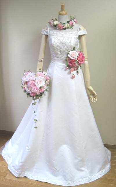 ドレスコサージュとお揃いのブーケ、リストブーケ、アームブーケ、レイ風首飾り、花冠、髪飾り等々、